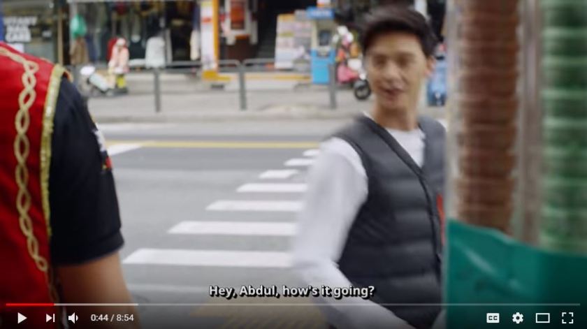 Right after he’s done patronising “Abdul”, the Korean man runs past two black men. What comes next? More condescension.