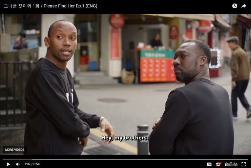 The Korean man says “Hey, my brothers”. The two men turn around.
